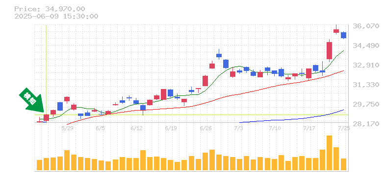 リスク管理の観点からは、過去のサポートラインや安値から推測するに、損切り価格をおおよそ36,000円前後に設定することが理想的です。これは、急な反転に備えるための安全策として機能します。将来的には、さらなる上昇が期待できるため、現状のトレンドをしっかりと見守りつつ、適切なタイミングでの利益確定も視野に入れると良いでしょう。