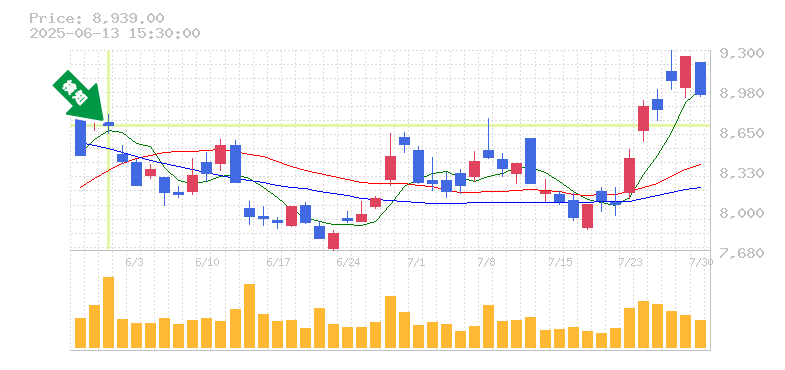 移動平均線を見てみると、短期的な平均が上昇しており、価格がこれを上回っているため、さらなる上昇が期待できる状況です。リスク管理の観点からは、損切りラインを少し下回った価格、例えば8300円あたりを設定すると良いでしょう。この価格を下回る場合は、トレンドの反転を考慮する必要があります。