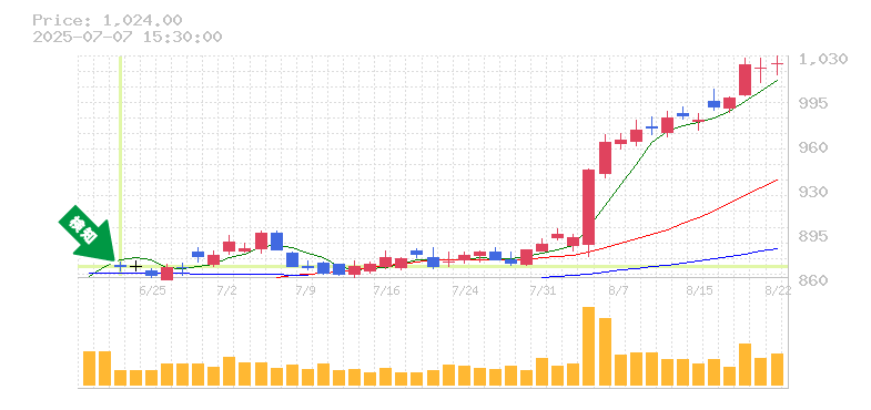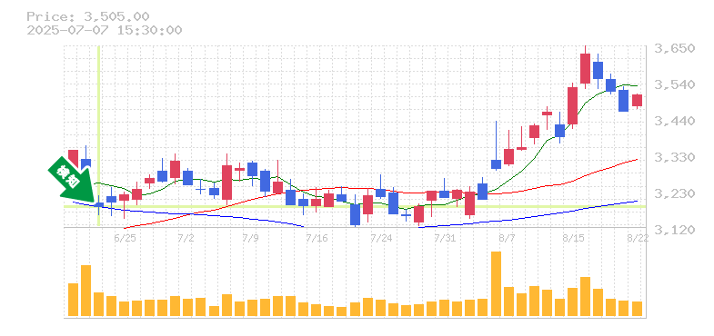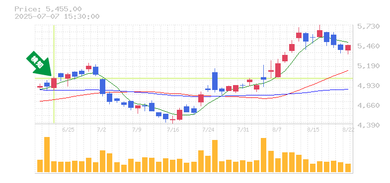 最近の株価動向を見てみると、価格は上昇傾向にあり、特に終値が5000円近くまで上昇しています。このことは、強い買い意欲を示しており、トレンドは非常にポジティブです。また、移動平均線も上昇しており、短期的な価格が中長期的な平均を上回る状態が続いています。これにより、今後のさらなる上昇が期待できるでしょう。