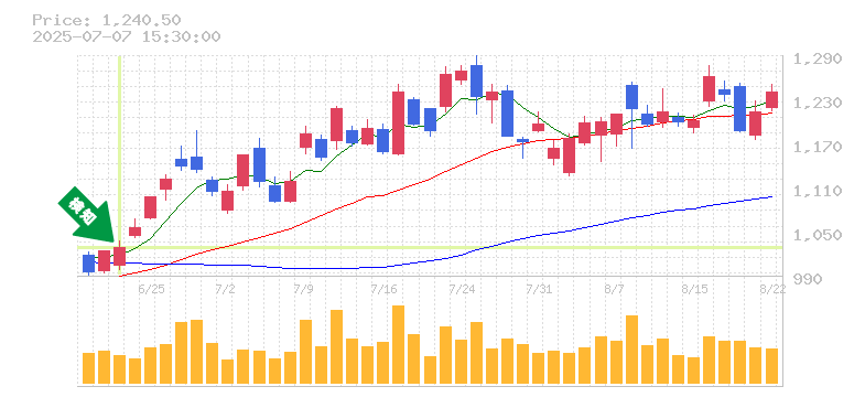 ここ最近の株価データを振り返ると、全体的に上昇トレンドが見受けられます。特に、短期的な移動平均線が安定しており、価格がそれを上回る動きを示していることから、ポジティブなシグナルが発信されています。このトレンドは、投資家にとって期待感を持たせる要因となるでしょう。