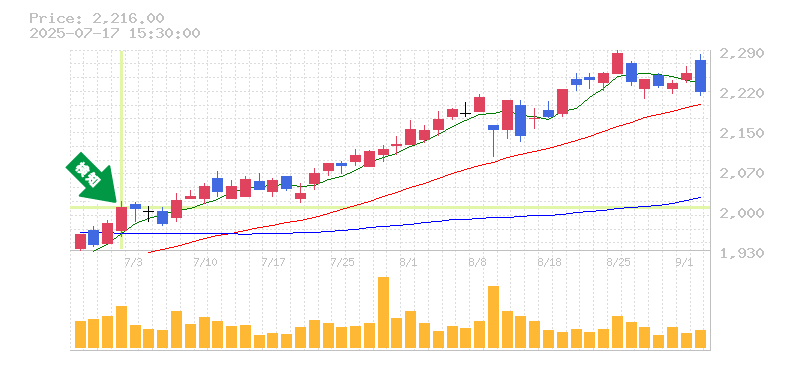 最近の株価データを分析すると、全体的に上昇トレンドが見られ、特に直近の取引日では終値が2000円を超えたことがポジティブなサインです。移動平均線も過去の安値からしっかりとサポートされており、短期的にも中期的にも強い基盤が築かれています。これは、今後のさらなる上昇の期待を持たせる要因となります。