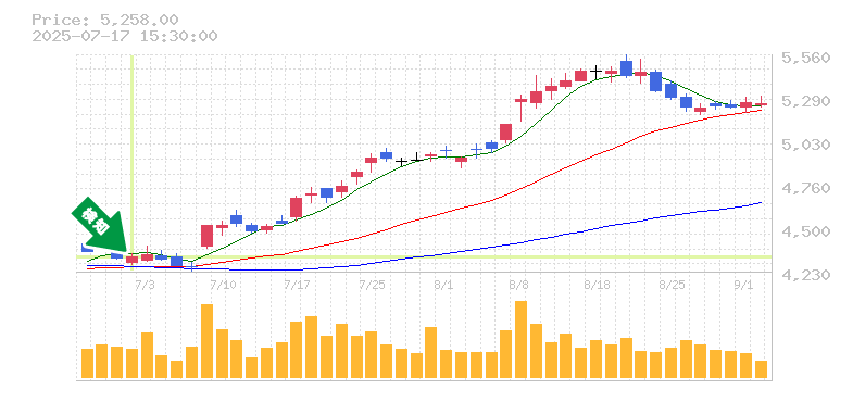ここ最近の株価動向を見てみると、全体として安定した価格帯を維持しており、特に高値圏での取引が続いています。移動平均線からの乖離が小さく、トレンドは上向きの印象を受けます。最近の終値は4318円で、過去数日の高値と比較しても良好な水準を保っています。