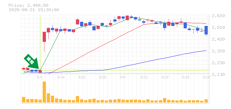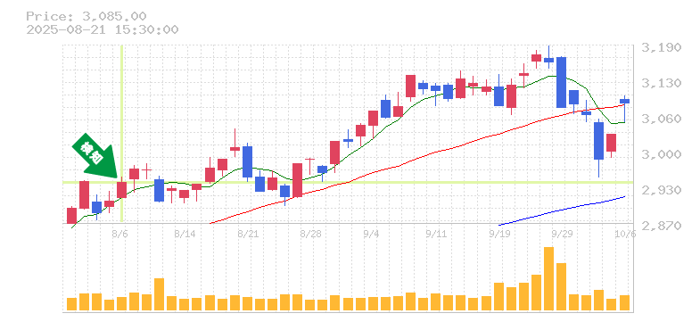 現在の株価は2950前後で、全体的に上昇トレンドを形成しています。特に、短期的な移動平均線が上向きになっており、最近の終値がこれを上回る動きは、今後の価格上昇を期待させます。また、出来高も安定しており、投資家の関心が高まっていることを示唆しています。