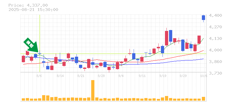 最近の株価データを見てみると、全体的に上昇トレンドが見られ、特に終値が3950付近で安定していることが印象的です。移動平均線も上向きであり、短期的な価格が中長期の平均を上回っていることから、強い上昇基調が続いていると考えられます。また、直近の高値や出来高の増加も、このトレンドの持続性を示唆しています。
