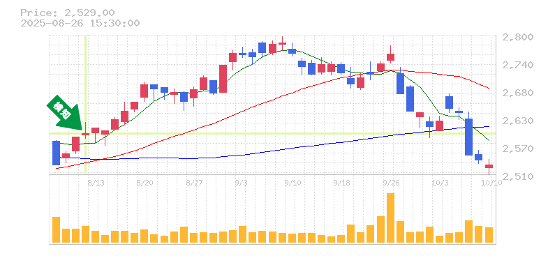 ここ最近の株価は、明確な上昇トレンドを形成しています。特に、直近の終値は2595.25と、過去の安値から見ても強い反発を示しています。短期的な移動平均線も上昇傾向にあり、価格がこれに沿って動いている点はポジティブです。これからの展開として、さらなる上昇が期待できる状況です。