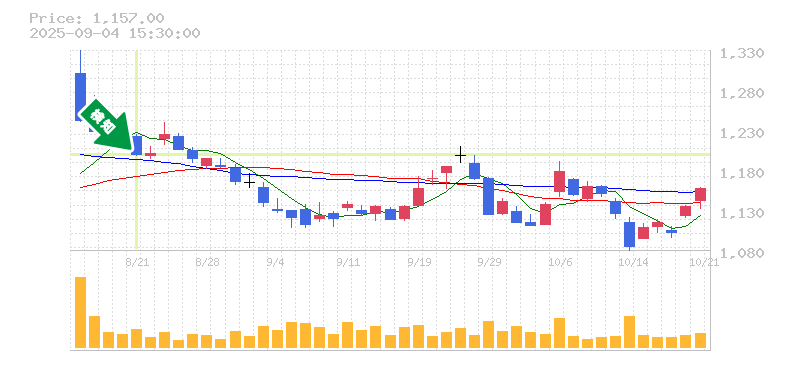 損切り価格の目安としては、最近の安値を基準にし、終値から数%下げた水準、具体的には約1150円前後を考慮するのが良いでしょう。この水準を下回ると、トレンドが反転する可能性があるため、リスク管理として重要です。