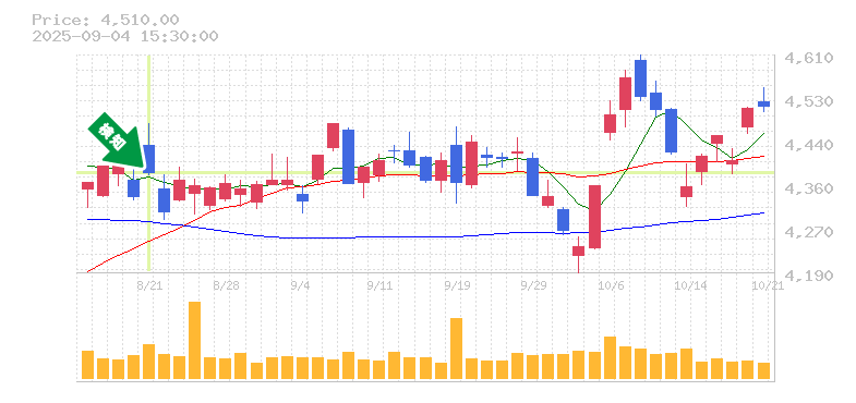 株価は最近、上昇トレンドを示しており、直近の終値は4400円台を維持しています。この動きは、過去のデータと比較してもポジティブなシグナルであり、特に移動平均線は上昇傾向を示しています。特に短期の移動平均線が長期のそれを上回る「ゴールデンクロス」を形成する可能性があり、さらなる上昇が期待できます。