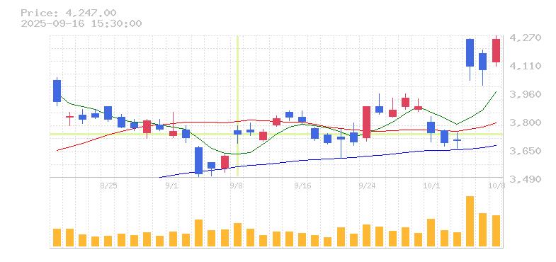 | 3,747円 | 3,772円 | 3,677円 | 3,727円 | 36,582,600 |