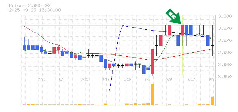 現在の株価は3970前後で推移しており、過去数日間の価格動向は非常に安定しています。移動平均線も比較的高い位置で推移しており、特に短期的なMA5と長期的なMA75が近づいていることから、上昇トレンドが続く可能性が示唆されています。この安定感は、投資家にとってポジティブな要素です。