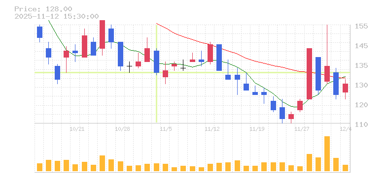 | 株価:133円(-7.64%)前日比:-11 | ||||