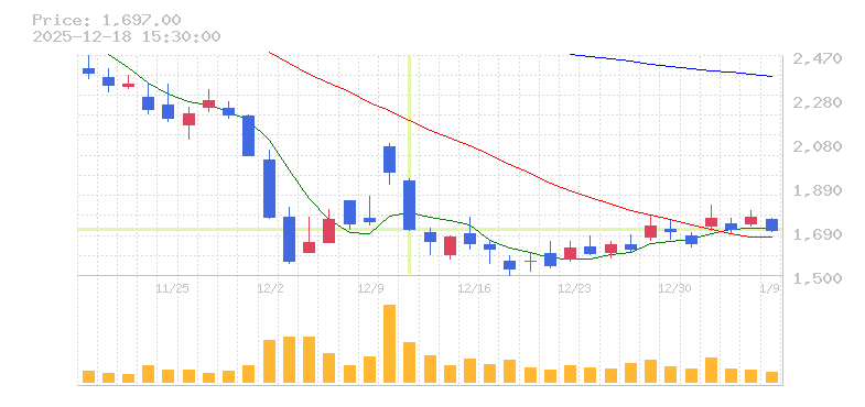 | 株価:1,702円(-12.94%)前日比:-253 | ||||