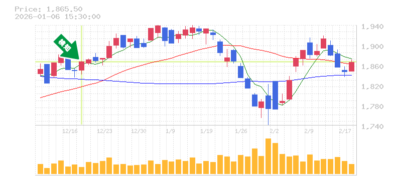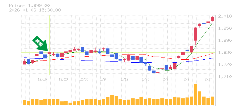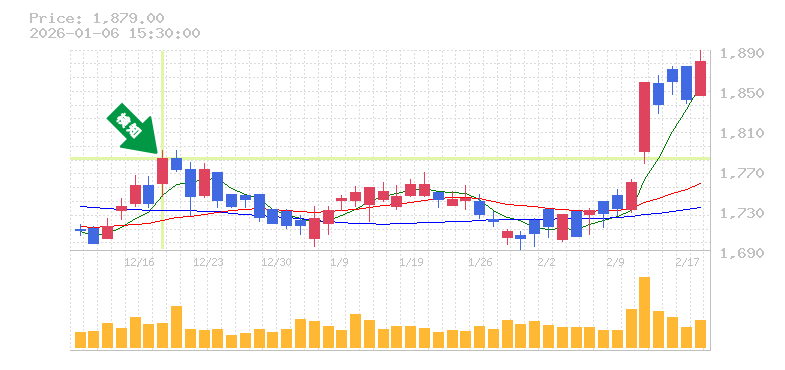 最近の株価は上昇基調にあり、特に直近の終値は1781.5と、過去数週間の動きから見ても高い位置にあります。移動平均線も全体的に上昇を示しており、短期的なトレンドが強いことが伺えます。特に5日移動平均線が上昇していることから、短期的な買い圧力が続いていることが確認できます。