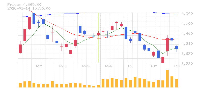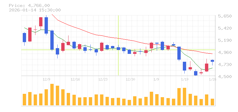 | 株価:4,993円(-0.68%)前日比:-34 | ||||