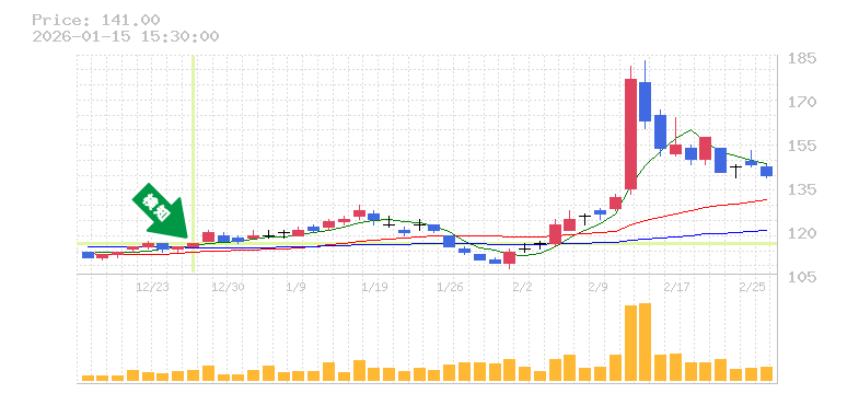 リスク管理の観点からは、損切り価格を115円前後に設定すると良いかもしれません。この水準を下回ると、トレンドが変わる可能性が高まりますので、注意が必要です。今後の展開としては、良好な出来高の推移も見られるため、ポジティブなニュースや業績改善があれば、株価がさらに上昇する余地がありそうです。