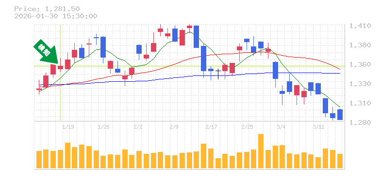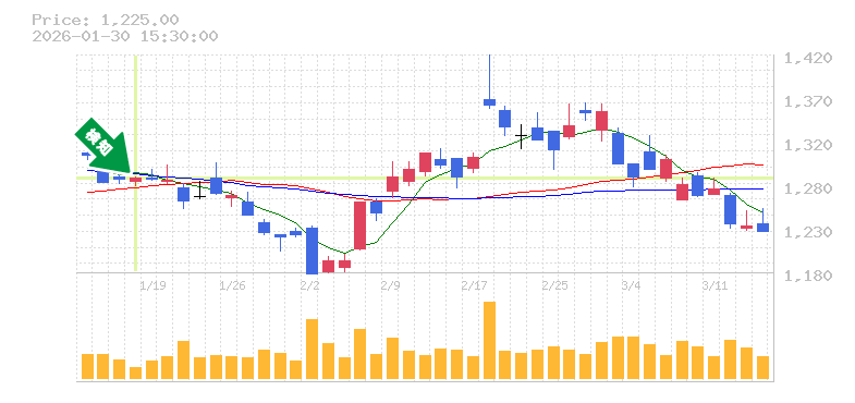 株価データを分析すると、全体的に上昇トレンドが見られ、特に最近の価格動向はポジティブです。移動平均線を考慮すると、短期的な動きは上昇を示唆しており、特に直近の高値付近に位置しています。このトレンドを維持できれば、さらなる上昇が期待できそうです。過去のデータから見ると、損切り価格の目安は1280円前後と考えますが、これはあくまで参考値として利用し、リスク管理を徹底することが重要です。