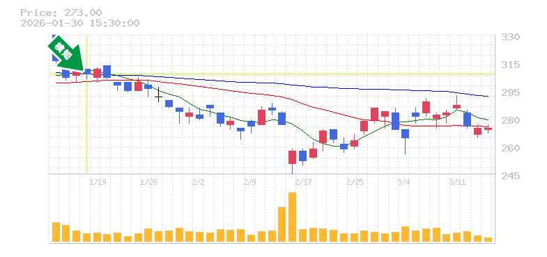 最近の株価動向を見ると、全体的に上昇トレンドが続いており、特に短期的な移動平均線が安定している印象を受けます。最近の終値は306前後で推移しており、これに対して長期的な移動平均線との乖離が少なく、今後の上昇余地が期待できる状況です。投資家にとっては、最近の高値を意識したポジティブな展望が持てそうです。