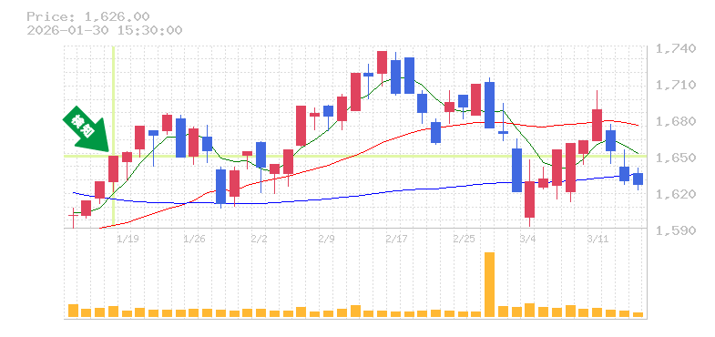 この銘柄は、最近の株価動向から見ると、上昇トレンドを保っており、特に直近の終値は1620円台を維持しています。移動平均線も過去のデータと比較して、安定したラインを描いていることから、上昇基調が続く可能性があります。特に、5日移動平均線が25日や75日移動平均線を上回っていることは、短期的な強さを示しています。