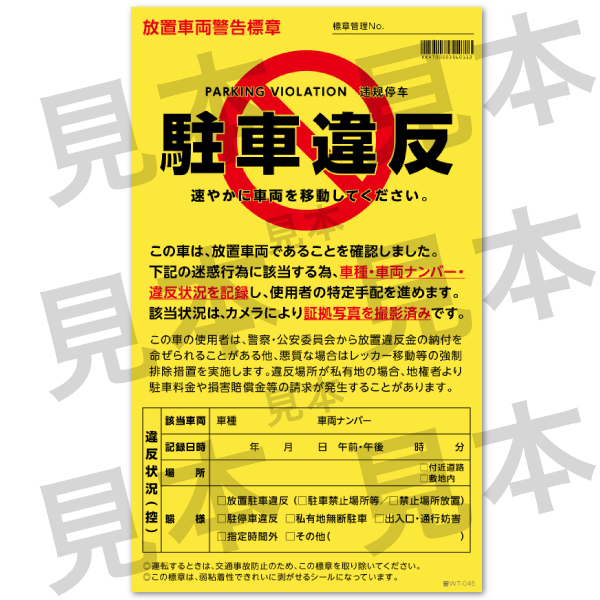 さらに、ステッカーには「標章No.」や偽のバーコードなど、細部に至るまでリアルなデザインが施されています。これにより、受け取った人が本格的な警告だと認識しやすくなっています。 また、警察からの罰金や、私有地の場合の駐車代金や損害賠償請求を示唆する文章も含まれており、貼られた持ち主に強いインパクトを与えます。