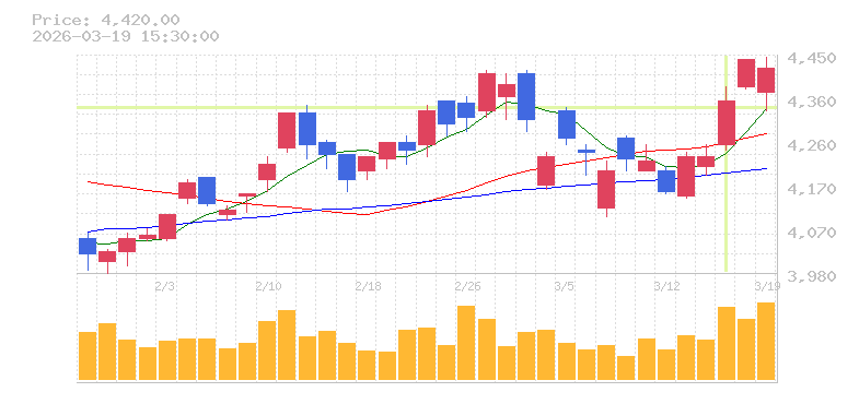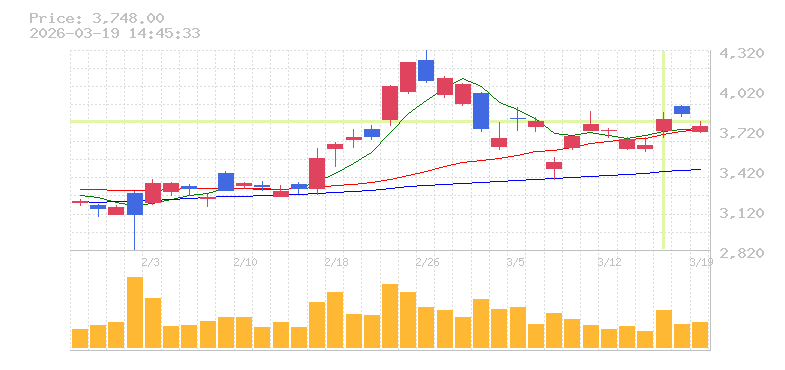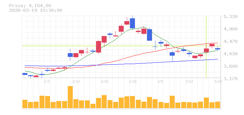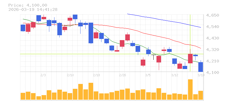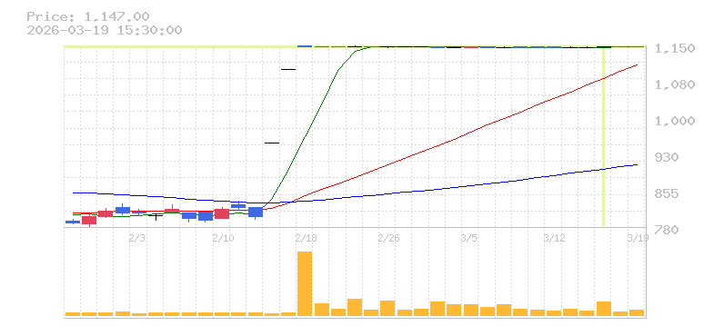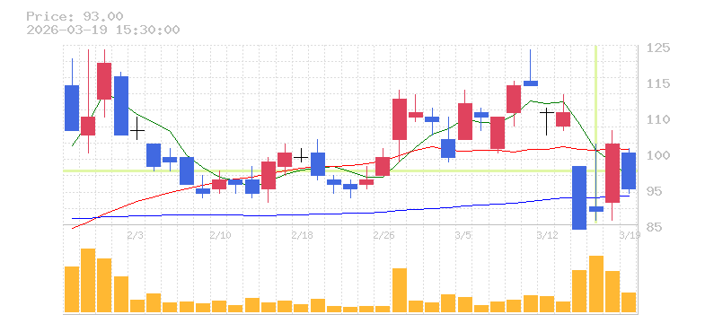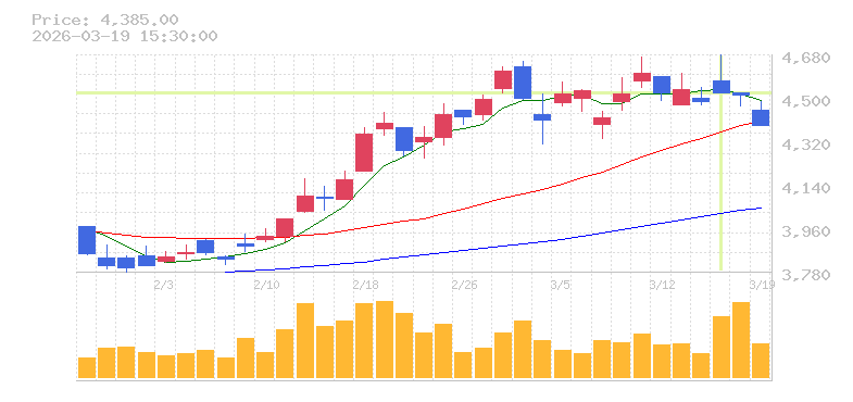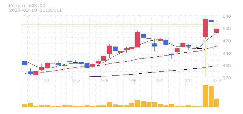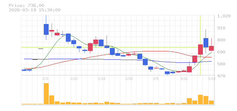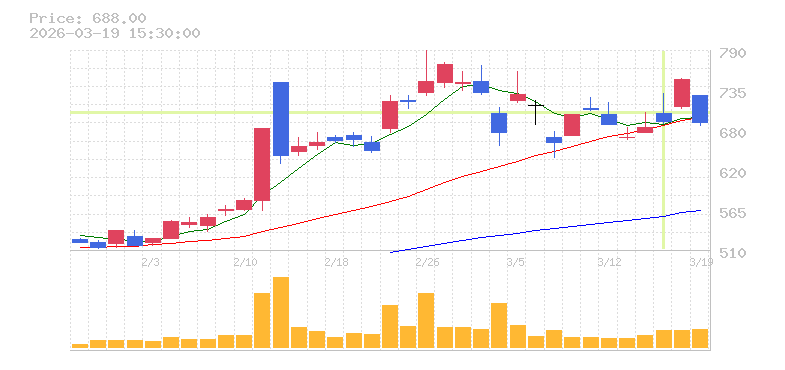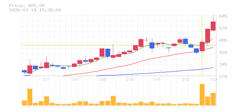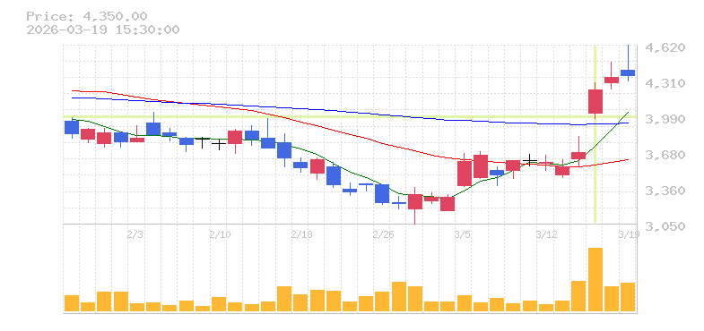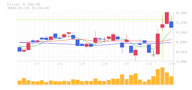 | +14.83% | 2.17倍 前日: 315,700 今日: 685,400 | 90 ※検知後推定 上昇出来高 275,900 下降出来高 176,100 +99,800 | 陽線 始:4020 高:4285 安:3975 乖:4.98% vwap:4124.6 stop:4083.4 - 15:57 AI診断 | |