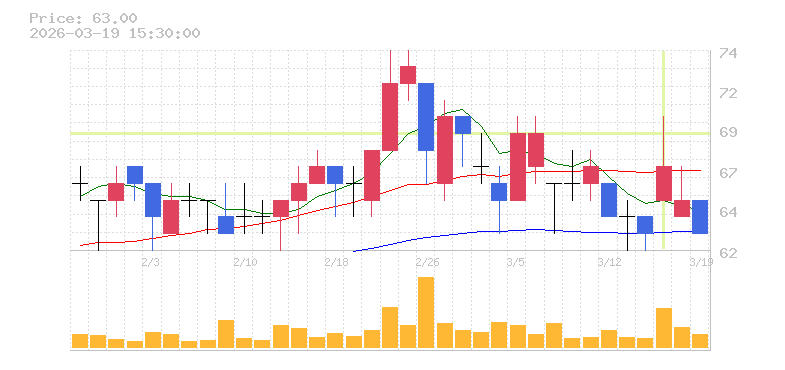 | +6.35% | 4.58倍 前日: 725,500 今日: 3,323,400 | 75 ※検知後推定 上昇出来高 435,200 下降出来高 1,451,700 -1,016,500 | 陽線 始:65 高:70 安:65 乖:3.08% vwap:67.4 stop:66.7 - 15:57 AI診断 | |