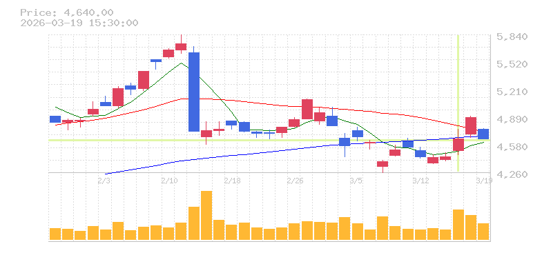 | +0.78% | 2.59倍 前日: 64,300 今日: 166,400 | 80 ※検知後推定 上昇出来高 0 下降出来高 0 0 | 陰線 始:4570 高:4680 安:4520 乖:-1.09% vwap:4561.3 stop:4515.7 - 15:56 AI診断 | |
