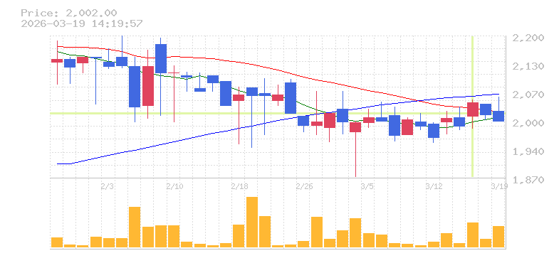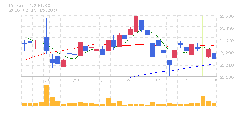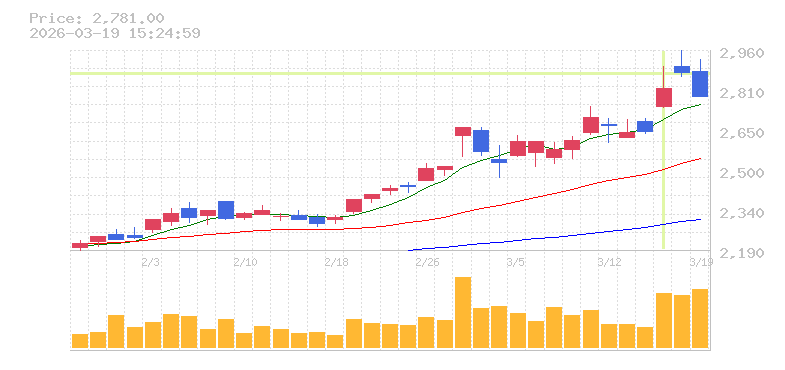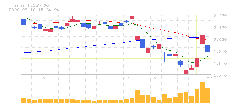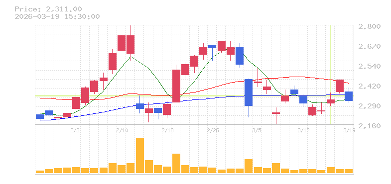 | +0.61% | 3.62倍 前日: 45,900 今日: 166,300 | 65 ※検知後推定 上昇出来高 31,900 下降出来高 41,700 -9,800 | 陽線 始:2323 高:2366 安:2303 乖:0.04% vwap:2325 stop:2301.8 - 15:57 AI診断 | |