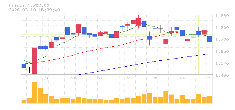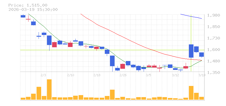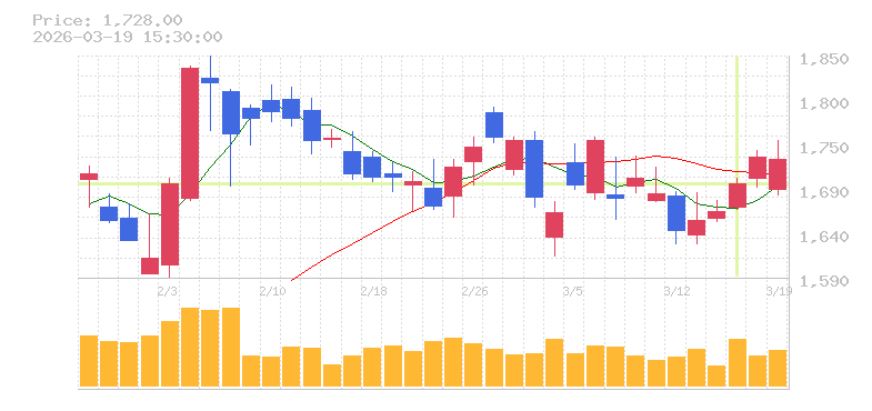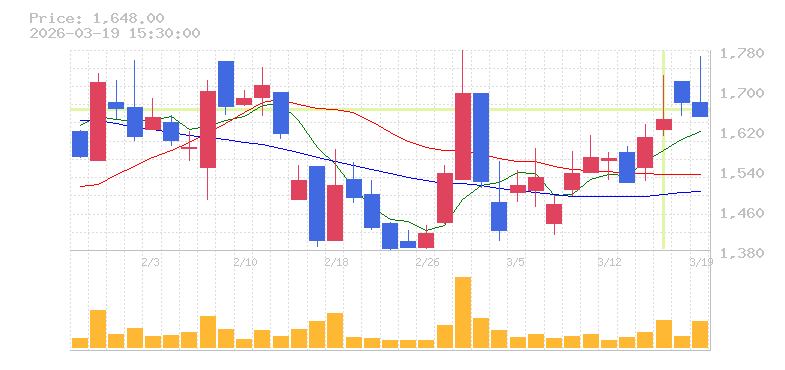 | +1.18% | 2.08倍 前日: 15,285,300 今日: 31,814,600 | 80 ※検知後推定 上昇出来高 4,332,000 下降出来高 1,284,100 +3,047,900 | 陰線 始:1620 高:1708 安:1374 乖:-10.06% vwap:1556.3 stop:1540.7 - 15:36 AI診断 | |