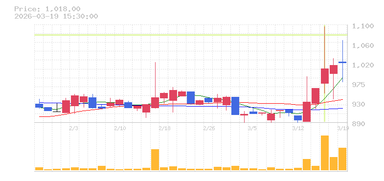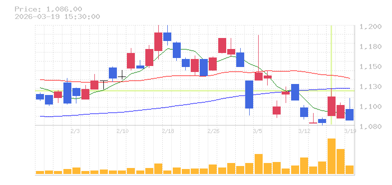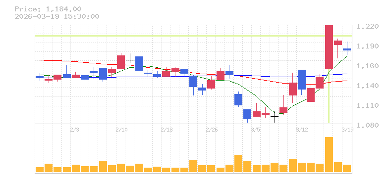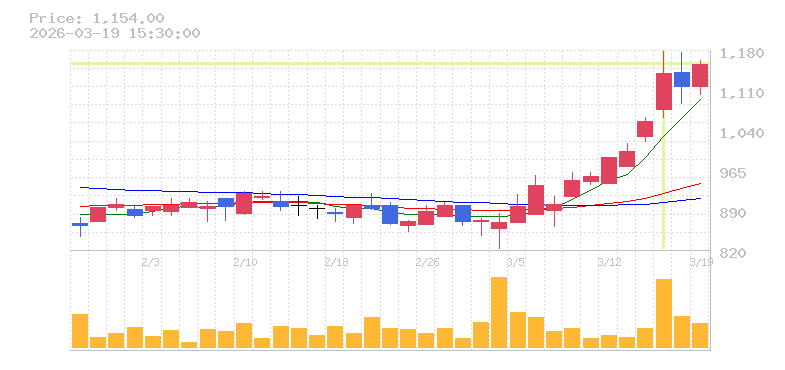 | +8.28% | 3.61倍 前日: 39,100 今日: 141,000 | 80 ※検知後推定 上昇出来高 21,700 下降出来高 33,100 -11,400 | 陽線 始:1073 高:1178 安:1059 乖:6.06% vwap:1128 stop:1116.7 - 15:57 AI診断 | |