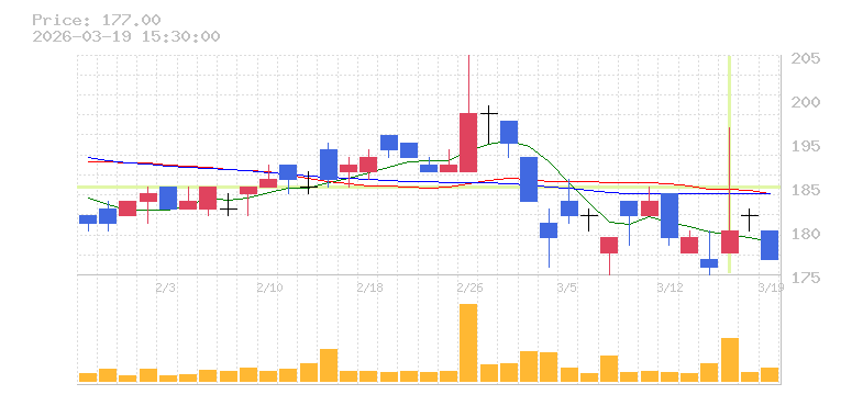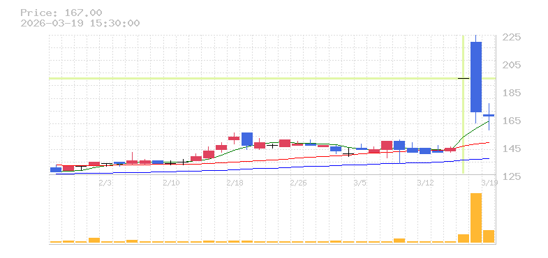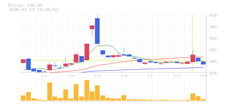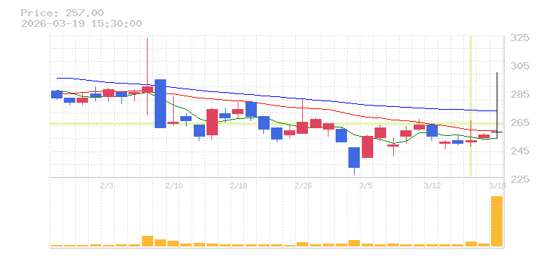 | +14.85% | 21.38倍 前日: 129,100 今日: 2,759,800 | 95 ※検知後推定 上昇出来高 1,047,200 下降出来高 1,378,100 -330,900 | 陽線 始:200 高:253 安:200 乖:16% vwap:229.4 stop:227.1 ★ 15:56 AI診断 | |