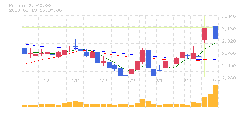 | +19.09% | 2.38倍 前日: 162,400 今日: 386,000 | 90 ※検知後推定 上昇出来高 0 下降出来高 131,100 -131,100 | 陽線 始:2921 高:3125 安:2858 乖:6.98% vwap:3058 stop:3027.4 - 15:57 AI診断 | |