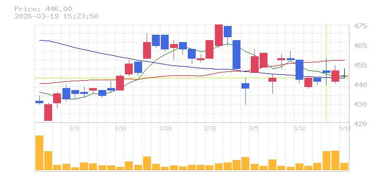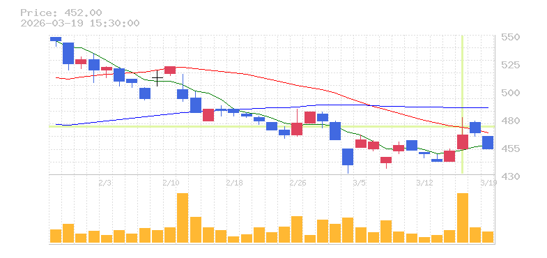 | +1.13% | 2.80倍 前日: 142,600 今日: 399,000 | 65 ※検知後推定 上昇出来高 45,200 下降出来高 14,800 +30,400 | 陰線 始:449 高:456 安:441 乖:-0.22% vwap:445.6 stop:441.1 - 15:57 AI診断 | |