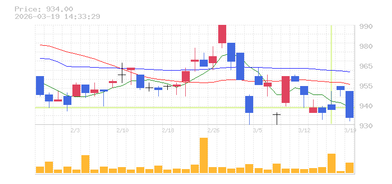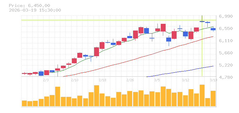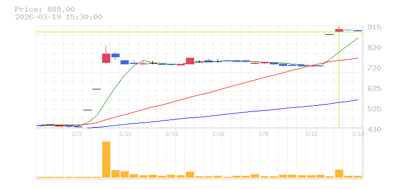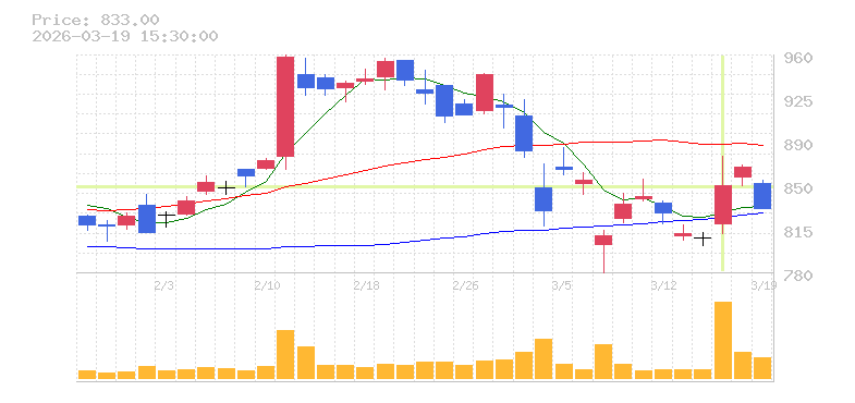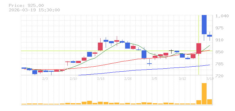 | +6.98% | 10.16倍 前日: 8,700 今日: 88,400 | 65 ※検知後推定 上昇出来高 23,900 下降出来高 3,100 +20,800 | 陽線 始:834 高:889 安:823 乖:6.59% vwap:847.9 stop:839.4 - 15:57 AI診断 | |