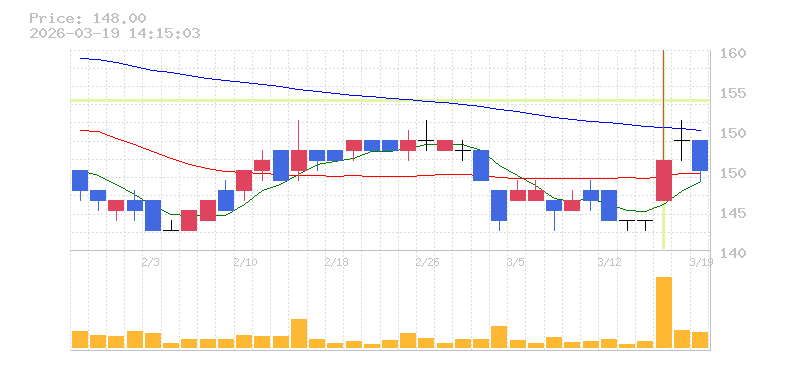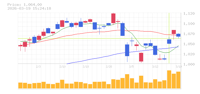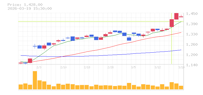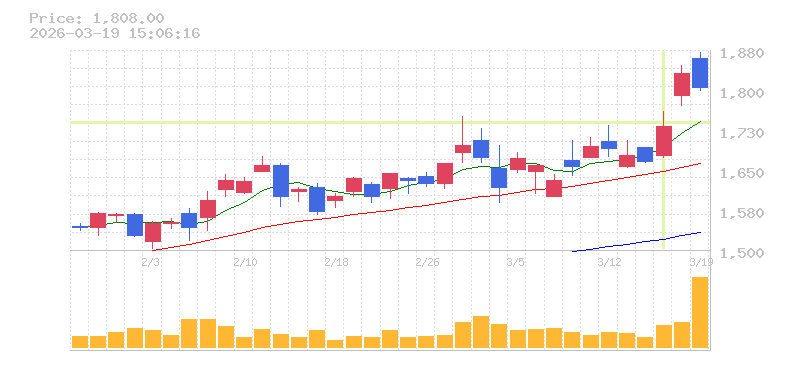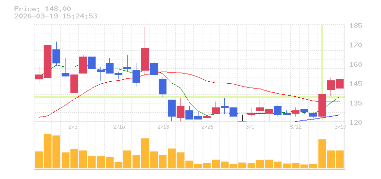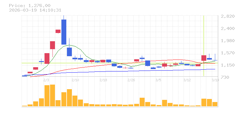 | +26.25% | 14.88倍 前日: 17,800 今日: 264,900 | 85 ※検知後推定 上昇出来高 191,000 下降出来高 28,600 +162,400 | 陽線 始:1263 高:1443 安:1161 乖:14.25% vwap:1340.7 stop:1327.3 - 15:57 AI診断 | |