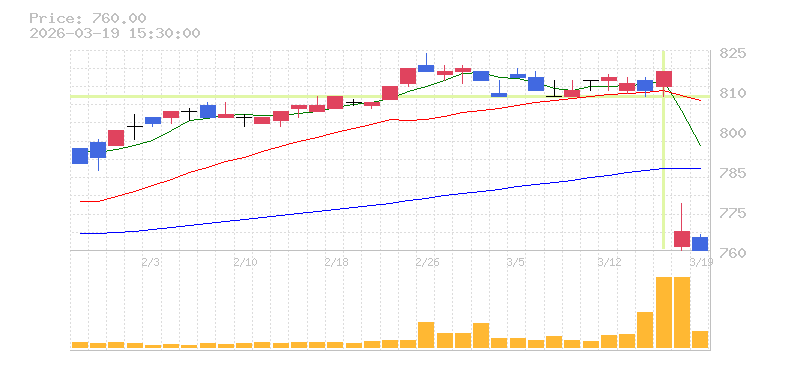 | +0.74% | 2.04倍 前日: 52,500 今日: 107,300 | 60 ※検知後推定 上昇出来高 37,300 下降出来高 7,000 +30,300 | 陽線 始:813 高:818 安:810 乖:0.62% vwap:813.6 stop:805.5 - 15:57 AI診断 | |