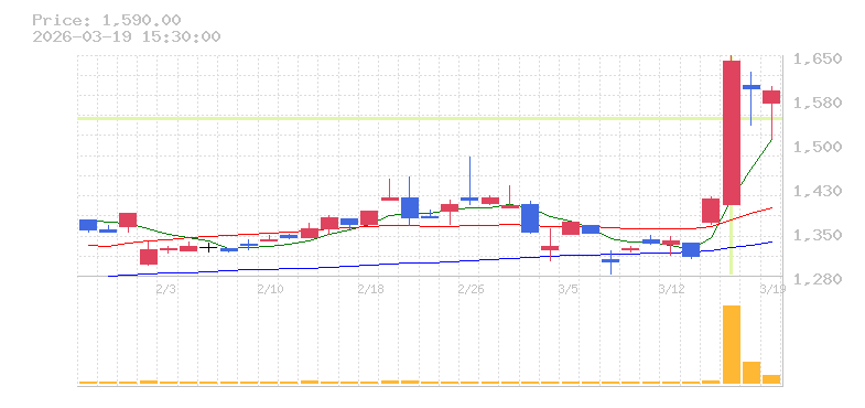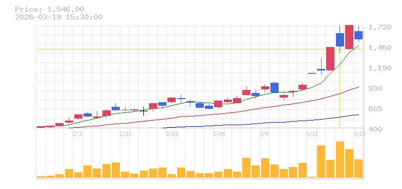 | +16.32% | 45.87倍 前日: 24,400 今日: 1,119,200 | 95 ※検知後推定 上昇出来高 630,600 下降出来高 340,300 +290,300 | 陽線 始:1400 高:1649 安:1399 乖:17.07% vwap:1568.1 stop:1552.4 - 15:56 AI診断 | |
