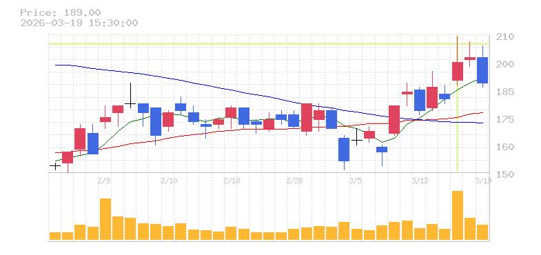 | +8.79% | 4.71倍 前日: 1,450,100 今日: 6,834,600 | 90 ※検知後推定 上昇出来高 1,786,300 下降出来高 2,827,900 -1,041,600 | 陽線 始:190 高:209 安:188 乖:4.21% vwap:201.8 stop:199.8 - 15:56 AI診断 | |