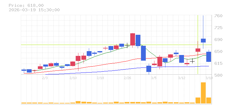 | +0.30% | 3.44倍 前日: 3,512,600 今日: 12,090,800 | 80 ※検知後推定 上昇出来高 2,828,600 下降出来高 4,282,800 -1,454,200 | 陰線 始:731 高:771 安:654 乖:-7.93% vwap:711.7 stop:704.6 - 15:56 AI診断 | |