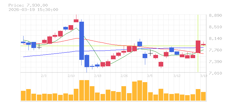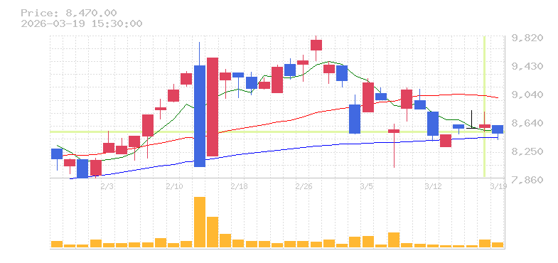 | +0.59% | 5.19倍 前日: 1,600 今日: 8,300 | 55 ※検知後推定 上昇出来高 900 下降出来高 1,400 -500 | 陽線 始:8550 高:8770 安:8490 乖:0.47% vwap:8578.8 stop:8493 - 15:59 AI診断 | |