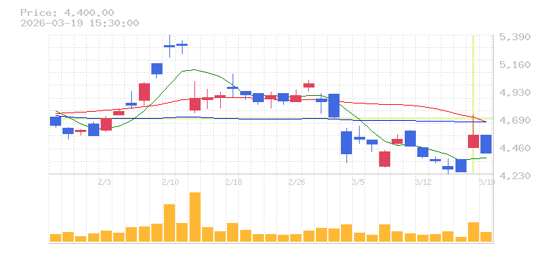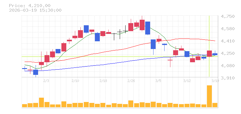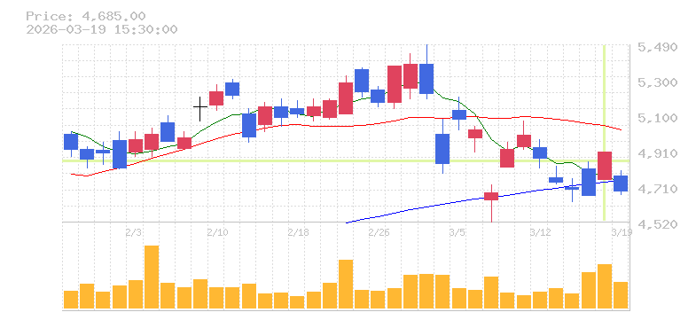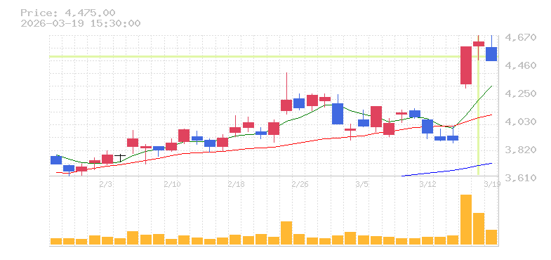 | +0.87% | 0.62倍 前日: 568,700 今日: 351,500 | 50 ※検知後推定 上昇出来高 94,300 下降出来高 69,400 +24,900 | 陽線 始:4590 高:4665 安:4480 乖:0.65% vwap:4569.6 stop:4523.9 ★ 15:59 AI診断 | |
