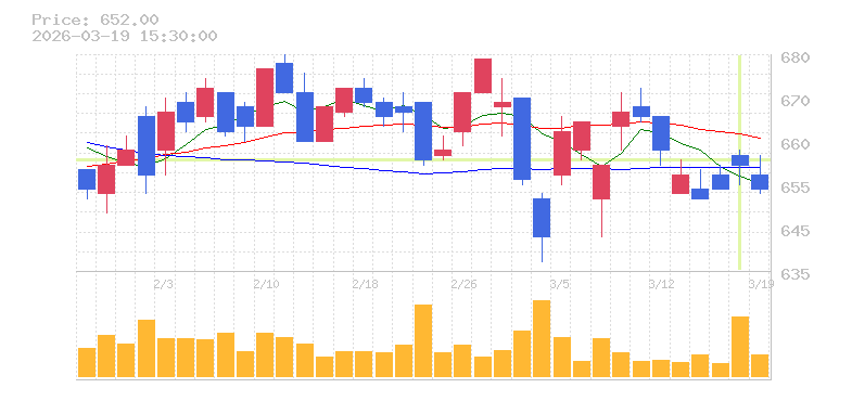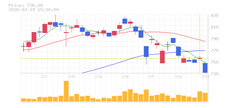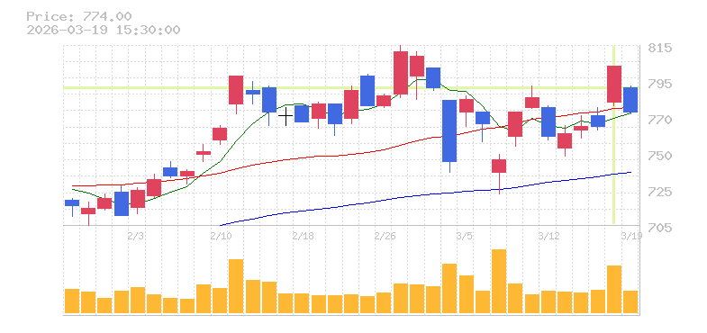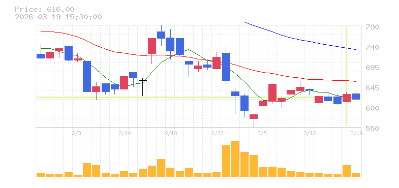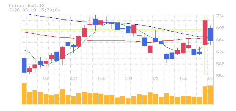 | +16.30% | 2.55倍 前日: 49,006,700 今日: 125,195,100 | 90 ※検知後推定 上昇出来高 39,317,200 下降出来高 26,767,100 +12,550,100 | 陽線 始:640.5 高:713.4 安:640.2 乖:11.38% vwap:687.3 stop:680.4 - 15:59 AI診断 | |