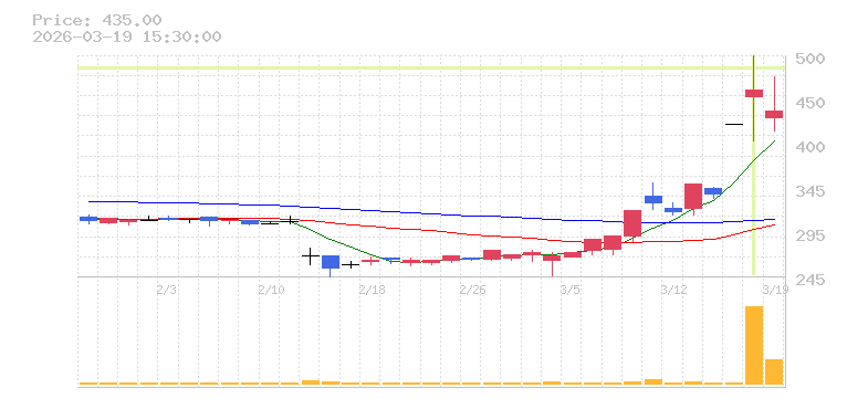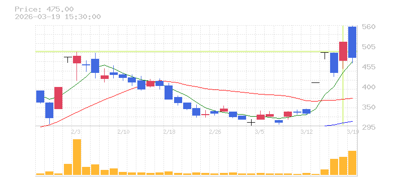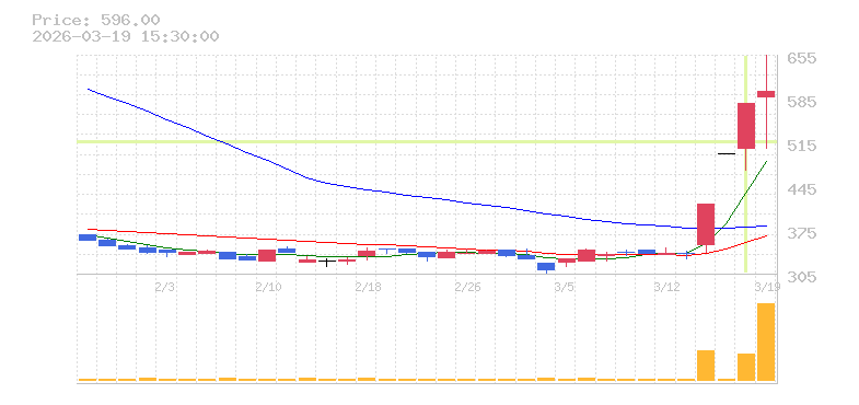 | +16.10% | 32.63倍 前日: 54,500 今日: 1,778,500 | 90 ※検知後推定 上昇出来高 1,005,200 下降出来高 0 +1,005,200 | 陽線 始:505 高:577 安:470 乖:14.26% vwap:532.9 stop:527.6 - 16:00 AI診断 | |