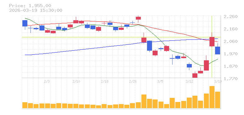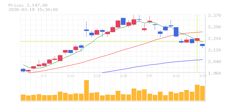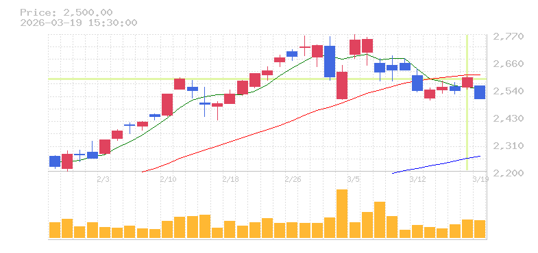 | +2.37% | 1.26倍 前日: 138,300 今日: 173,800 | 55 ※検知後推定 上昇出来高 16,600 下降出来高 0 +16,600 | 陽線 始:2549 高:2596 安:2540 乖:1.84% vwap:2569.6 stop:2543.9 - 15:44 AI診断 | |