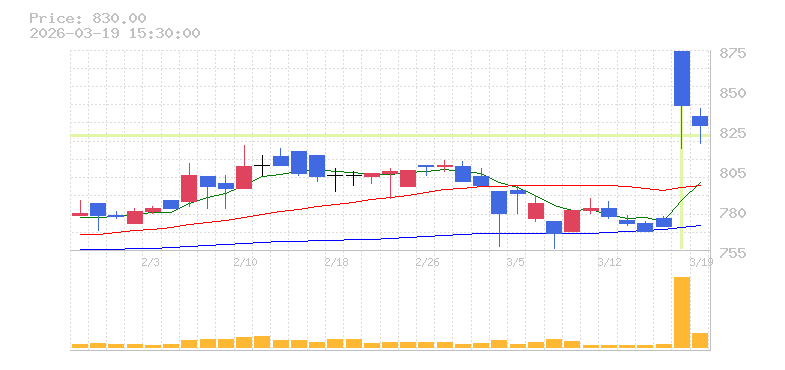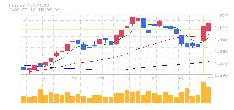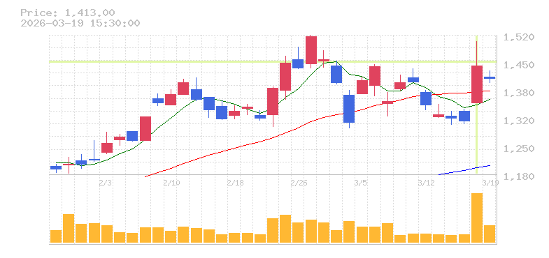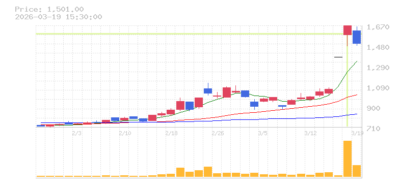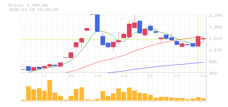 | +10.23% | 6.89倍 前日: 115,700 今日: 796,800 | 95 ※検知後推定 上昇出来高 222,200 下降出来高 318,600 -96,400 | 陽線 始:1354 高:1504 安:1354 乖:6.65% vwap:1449.8 stop:1435.3 - 15:59 AI診断 | |