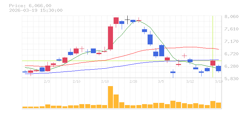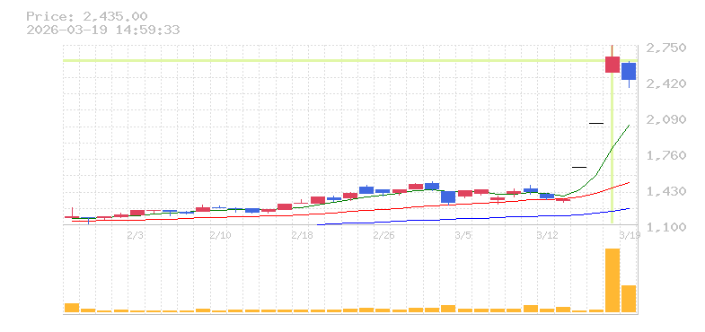 | +16.46% | 2.78倍 前日: 1,903,500 今日: 5,297,200 | 100 ※検知後推定 上昇出来高 2,018,100 下降出来高 1,378,700 +639,400 | 陽線 始:2404 高:2632 安:2402 乖:9.48% vwap:2512.3 stop:2487.2 - 16:00 AI診断 | |