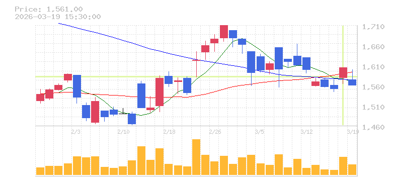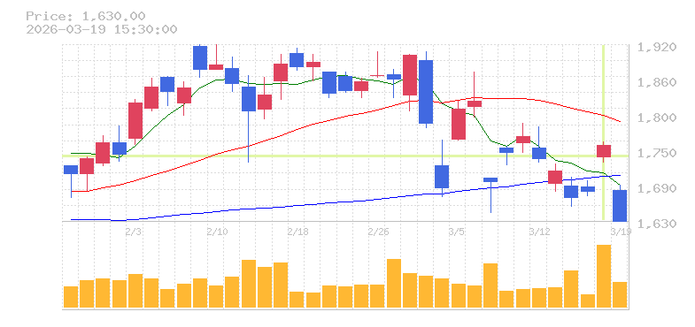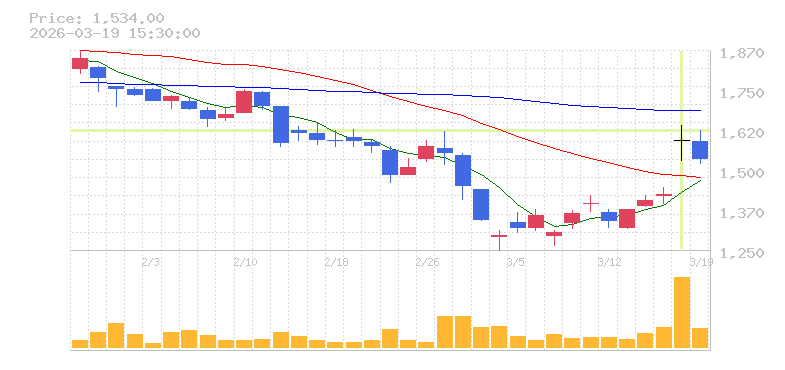 | +11.96% | 3.58倍 前日: 151,100 今日: 540,600 | 90 ※検知後推定 上昇出来高 178,400 下降出来高 205,500 -27,100 | 陽線 始:1591 高:1635 安:1528 乖:0% vwap:1579.5 stop:1563.7 - 16:00 AI診断 | |