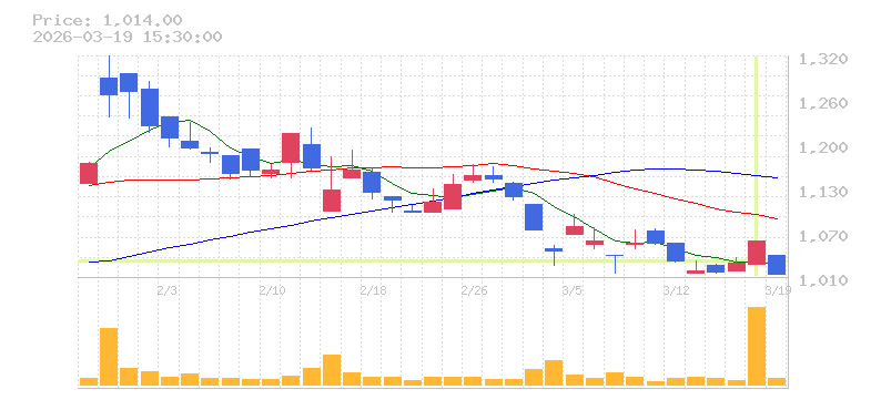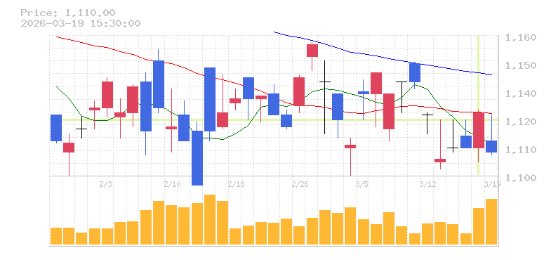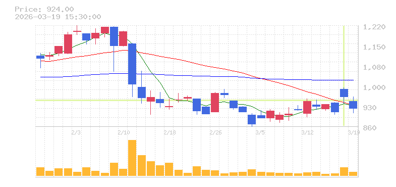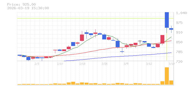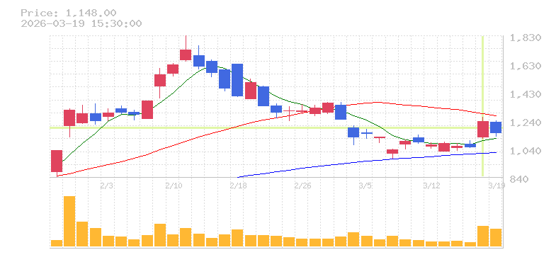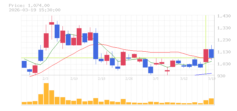 | +15.09% | 4.35倍 前日: 257,900 今日: 1,122,900 | 95 ※検知後推定 上昇出来高 445,800 下降出来高 213,200 +232,600 | 陽線 始:1039 高:1144 安:1039 乖:10.11% vwap:1098.8 stop:1087.8 - 16:00 AI診断 | |