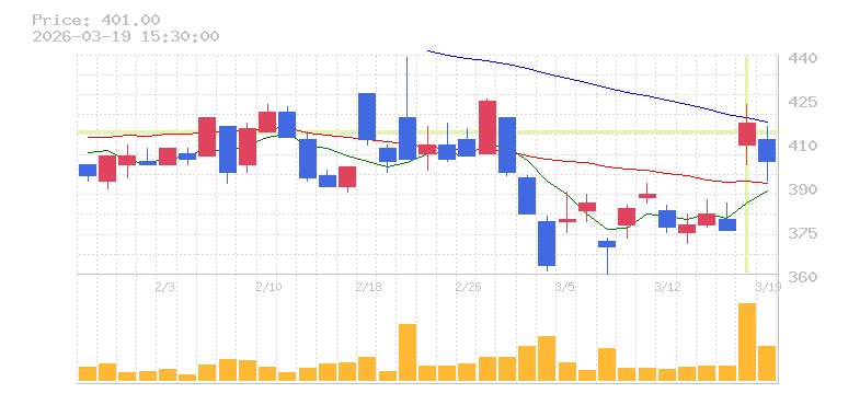 | +10.37% | 5.49倍 前日: 81,800 今日: 449,000 | 80 ※検知後推定 上昇出来高 127,800 下降出来高 184,200 -56,400 | 陽線 始:407 高:422 安:400 乖:1.97% vwap:411.8 stop:407.7 - 15:59 AI診断 | |