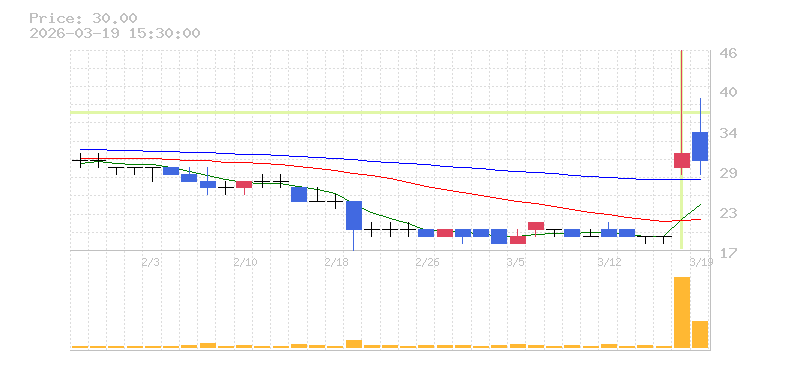 | +63.16% | 196.23倍 前日: 388,700 今日: 76,276,400 | 90 ※検知後推定 上昇出来高 23,539,300 下降出来高 41,869,100 -18,329,800 | 陽線 始:29 高:46 安:28 乖:6.9% vwap:37.9 stop:37.5 - 15:59 AI診断 | |