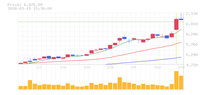 | +11.76% | 3.65倍 前日: 5,739,800 今日: 20,924,500 | 100 ※検知後推定 上昇出来高 8,170,000 下降出来高 6,175,500 +1,994,500 | 陽線 始:6470 高:7060 安:6445 乖:8.41% vwap:6894.9 stop:6826 ★ 15:59 AI診断 | |