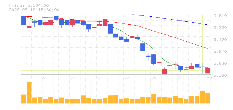 | +0.09% | 1.71倍 前日: 119,100 今日: 204,000 | 70 ※検知後推定 上昇出来高 70,800 下降出来高 31,500 +39,300 | 陰線 始:5535 高:5603 安:5385 乖:-0.13% vwap:5490.2 stop:5435.3 - 15:59 AI診断 |